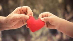 old hands holding young hands of a baby with red heart / Love and relationship...